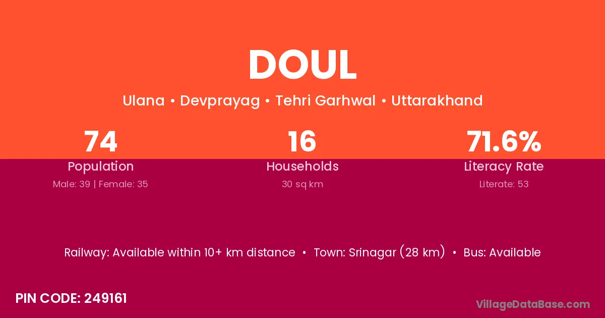 Doul village has a total population of 74 people, of which 39 are males and 35 are females.