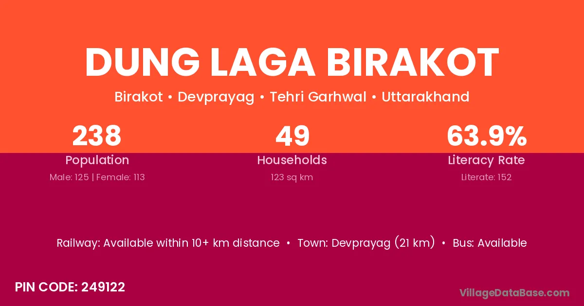 Devprayag (21 km) is the nearest town to Dung Laga Birakot village for major economic activities and is located approximately 21 km away.