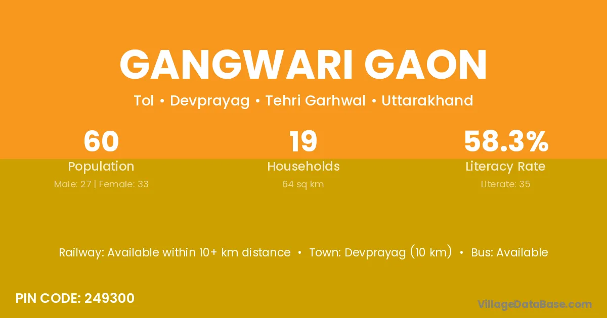 Devprayag (10 km) is the nearest town to Gangwari Gaon village for major economic activities and is located approximately 10 km away.