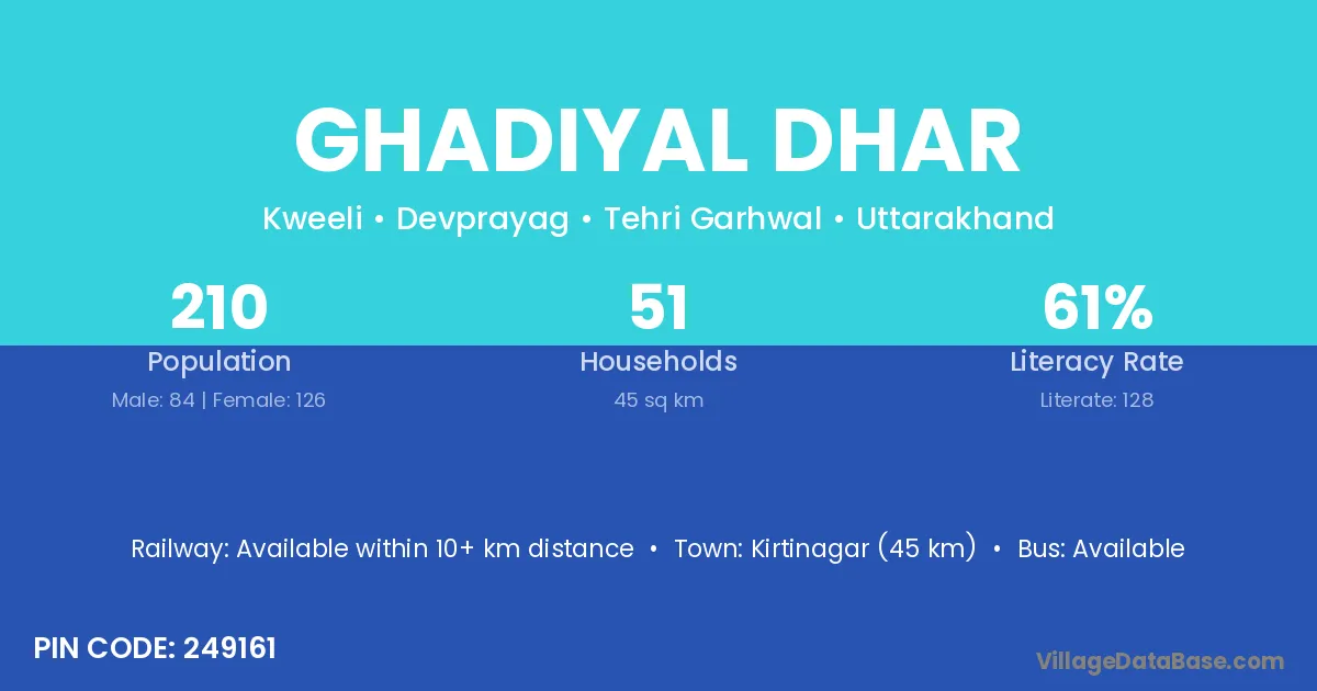 Kirtinagar (45 km) is the nearest town to Ghadiyal Dhar village for major economic activities and is located approximately 45 km away.