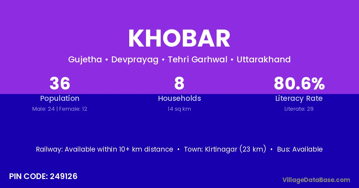 Kirtinagar (23 km) is the nearest town to Khobar village for major economic activities and is located approximately 23 km away.
