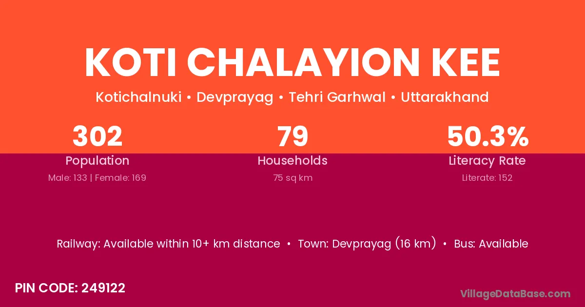 Devprayag (16 km) is the nearest town to Koti Chalayion Kee village for major economic activities and is located approximately 16 km away.