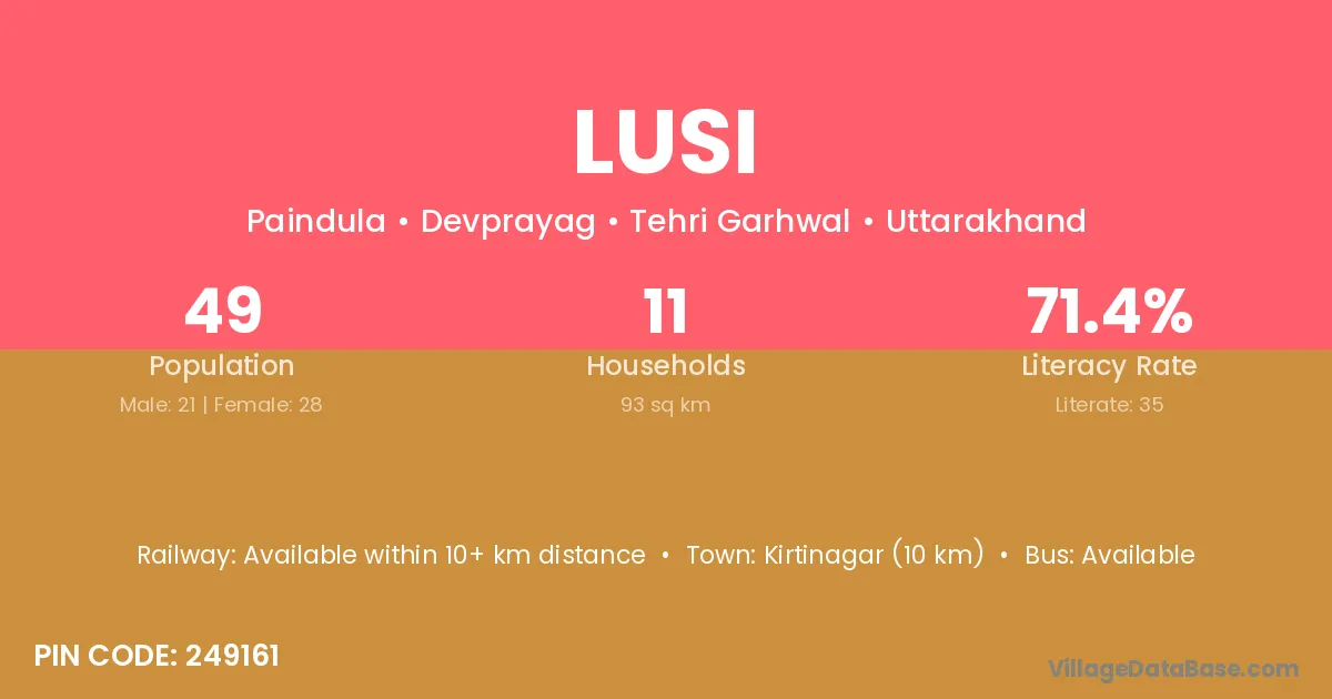 Kirtinagar (10 km) is the nearest town to Lusi village for major economic activities and is located approximately 10 km away.