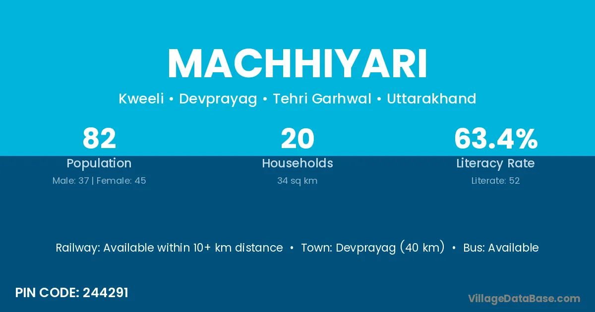 Devprayag (40 km) is the nearest town to Machhiyari village for major economic activities and is located approximately 40 km away.
