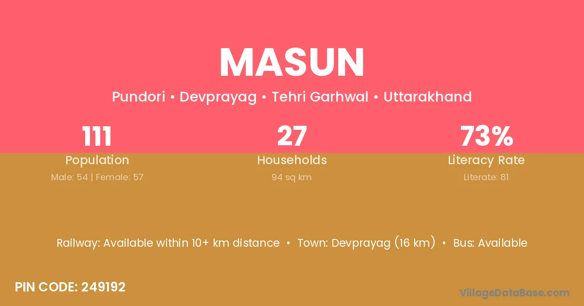 Devprayag (16 km) is the nearest town to Masun village for major economic activities and is located approximately 16 km away.