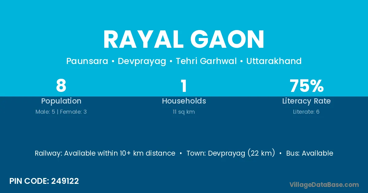 Devprayag (22 km) is the nearest town to Rayal Gaon village for major economic activities and is located approximately 22 km away.