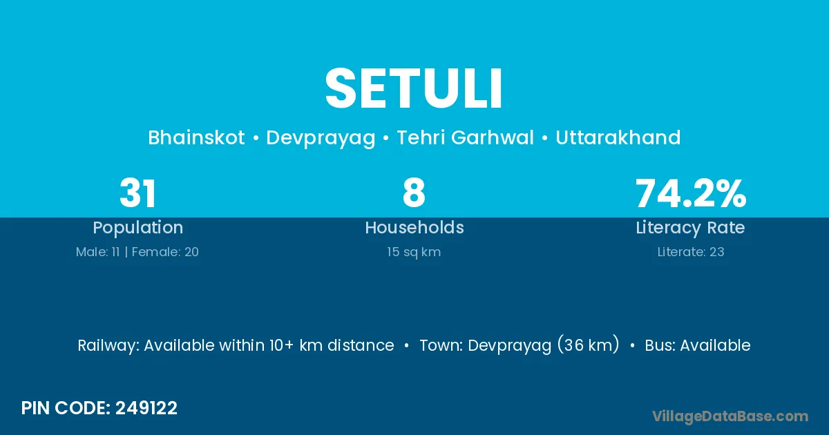 Devprayag (36 km) is the nearest town to Setuli village for major economic activities and is located approximately 36 km away.