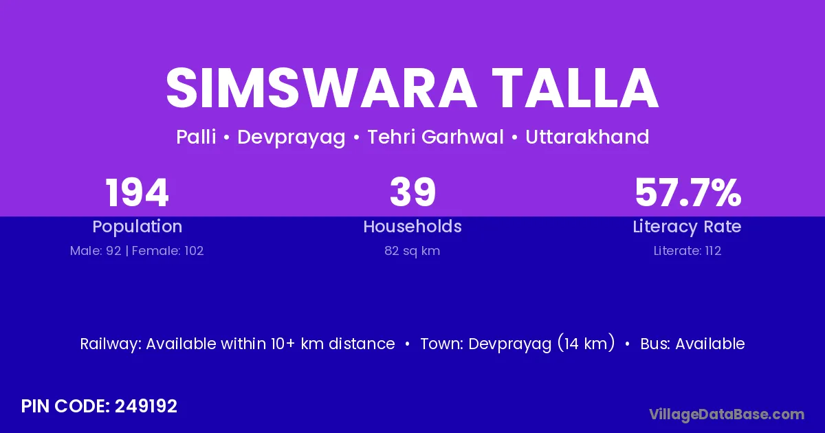 Devprayag (14 km) is the nearest town to Simswara Talla village for major economic activities and is located approximately 14 km away.