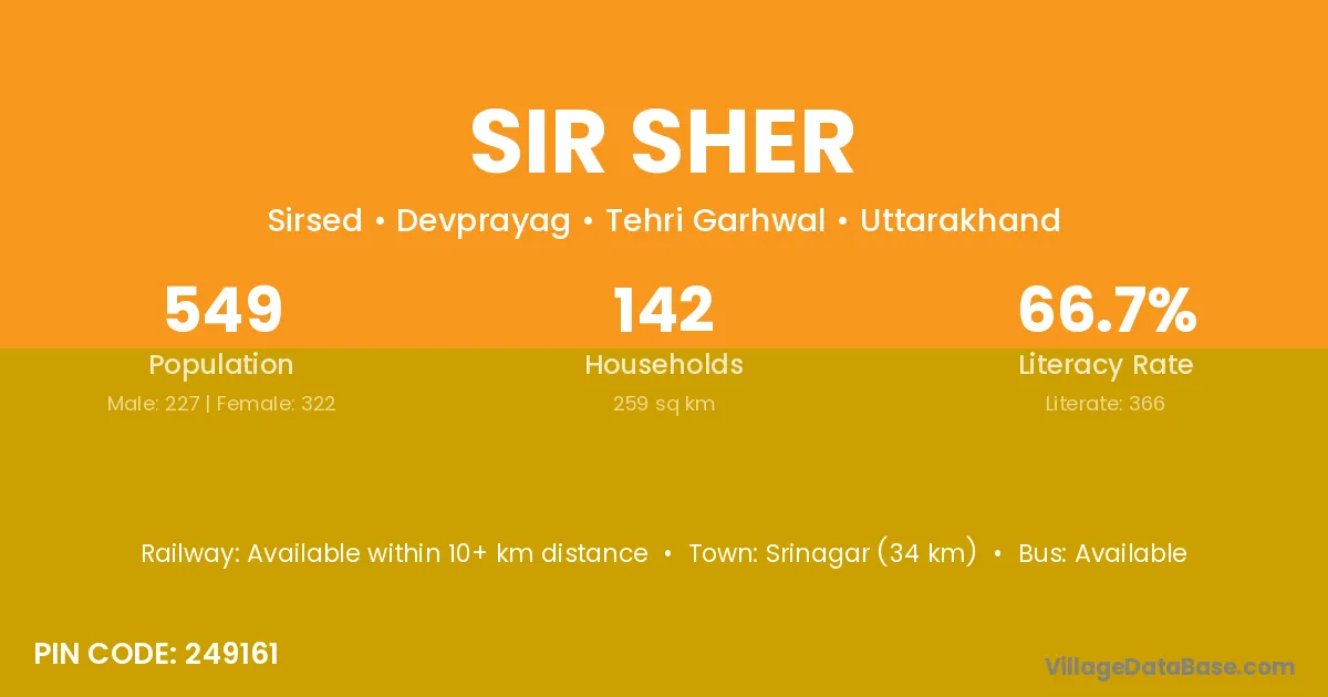 According to Census 2011 information, the village code of Sir Sher village is 249161.