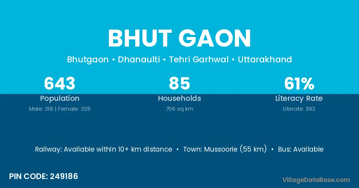 Bhut Gaon village has a total population of 643 people, of which 318 are males and 325 are females.