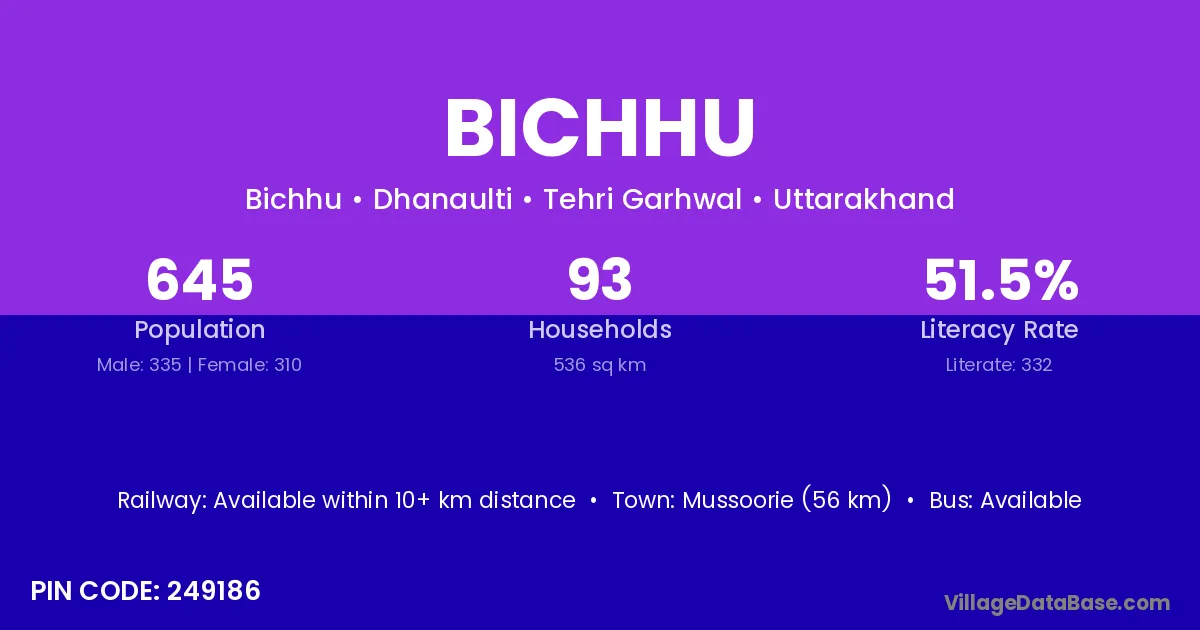 Mussoorie (56 km) is the nearest town to Bichhu village for major economic activities and is located approximately 56 km away.