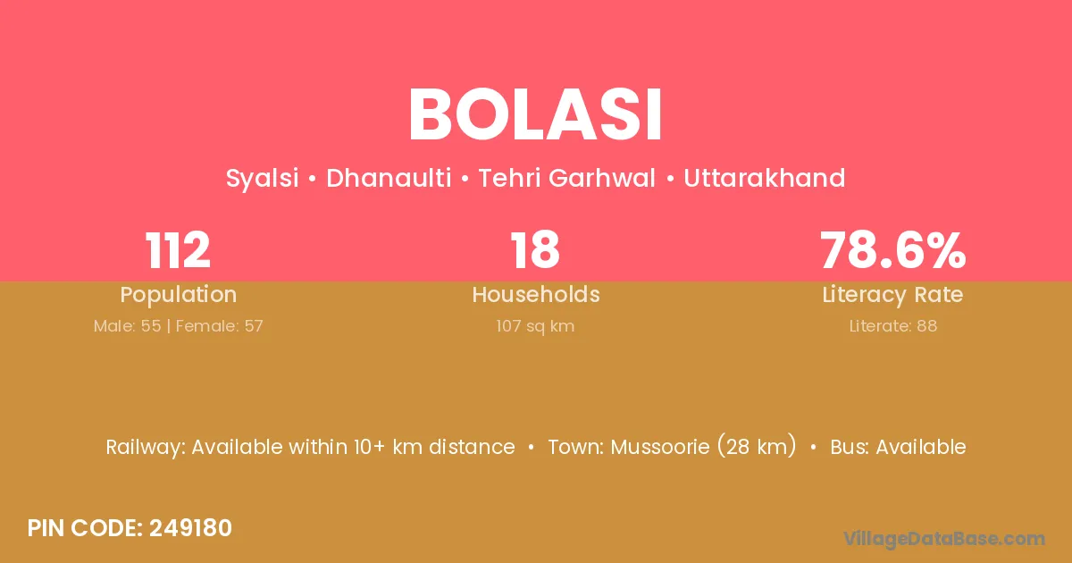 Mussoorie (28 km) is the nearest town to Bolasi village for major economic activities and is located approximately 28 km away.