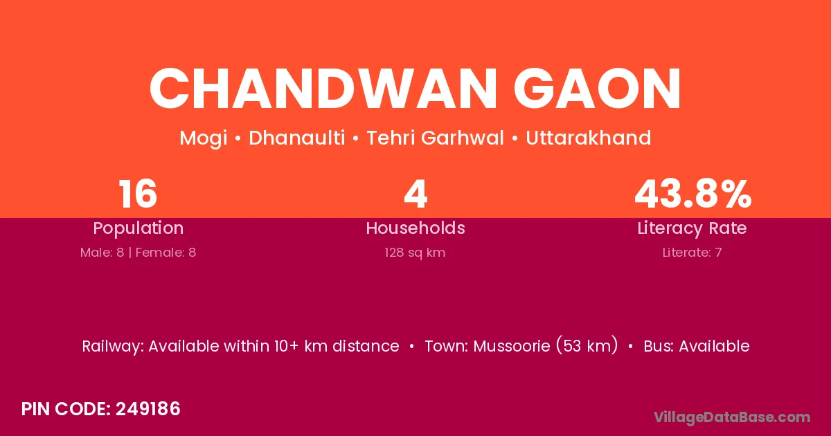 Chandwan Gaon village has a total population of 16 people, of which 8 are males and 8 are females.