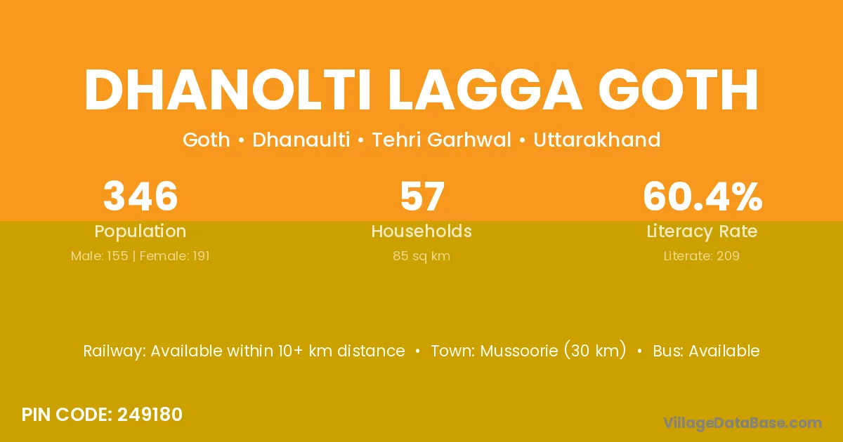 Mussoorie (30 km) is the nearest town to Dhanolti Lagga Goth village for major economic activities and is located approximately 30 km away.