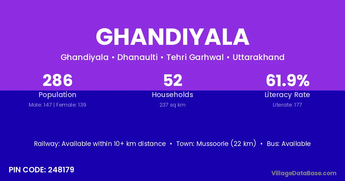 Mussoorie (22 km) is the nearest town to Ghandiyala village for major economic activities and is located approximately 22 km away.