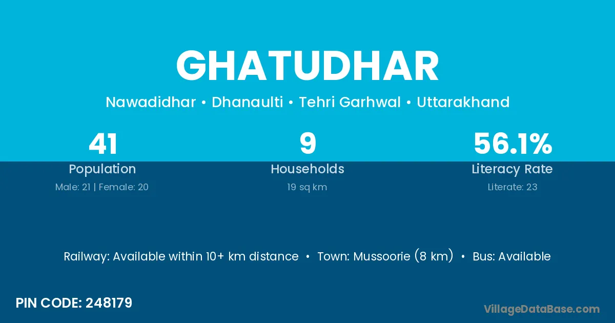 Mussoorie (8 km) is the nearest town to Ghatudhar village for major economic activities and is located approximately 8 km away.