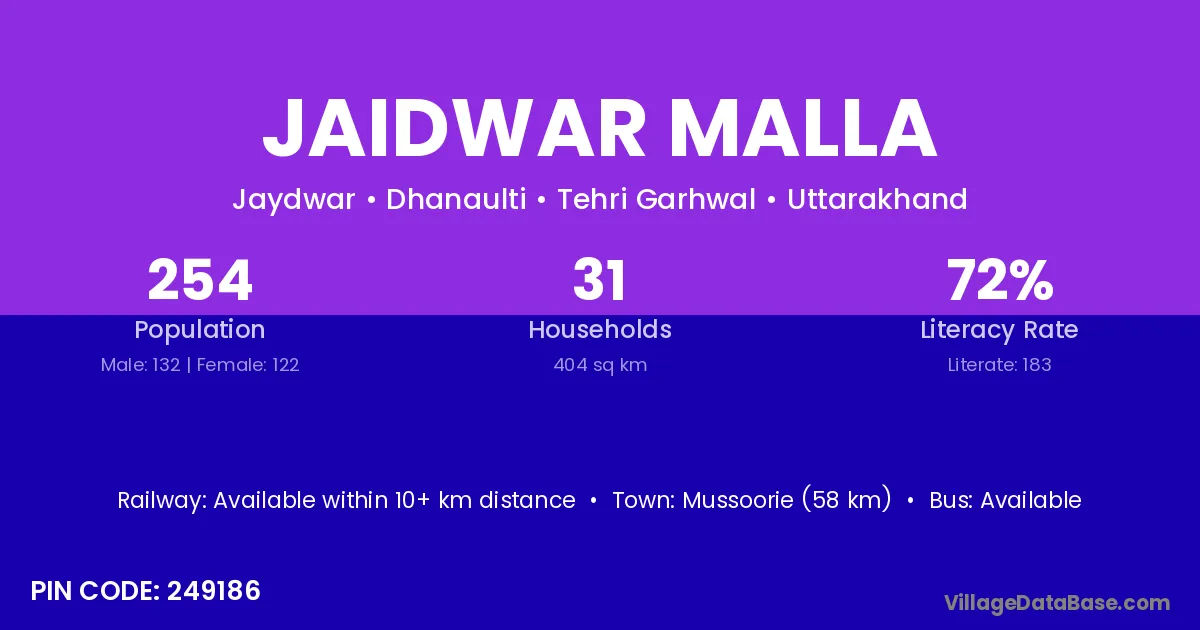 Mussoorie (58 km) is the nearest town to Jaidwar Malla village for major economic activities and is located approximately 58 km away.