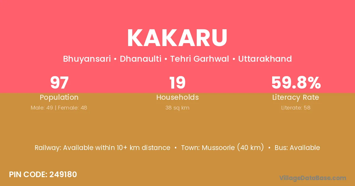 Mussoorie (40 km) is the nearest town to Kakaru village for major economic activities and is located approximately 40 km away.