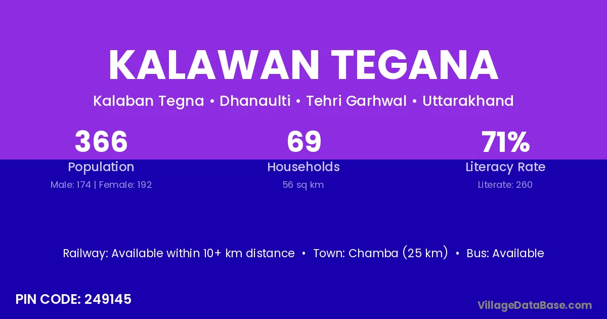 Kalawan Tegana village has a total population of 366 people, of which 174 are males and 192 are females.