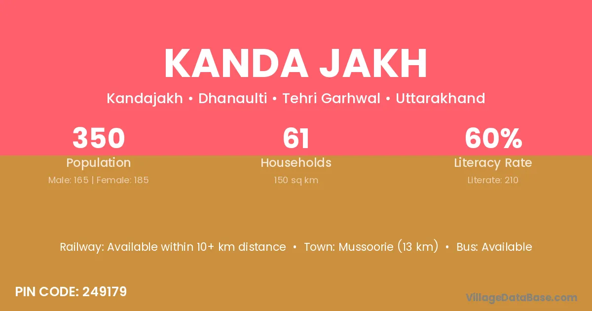 Mussoorie (13 km) is the nearest town to Kanda Jakh village for major economic activities and is located approximately 13 km away.