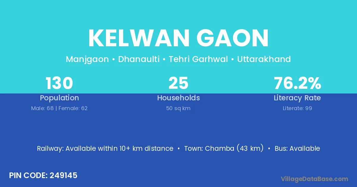 Chamba (43 km) is the nearest town to Kelwan Gaon village for major economic activities and is located approximately 43 km away.