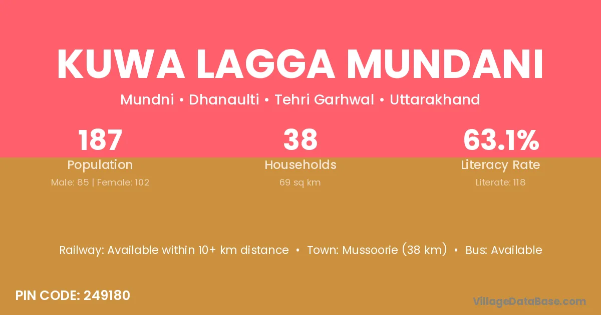 Mussoorie (38 km) is the nearest town to Kuwa Lagga Mundani village for major economic activities and is located approximately 38 km away.