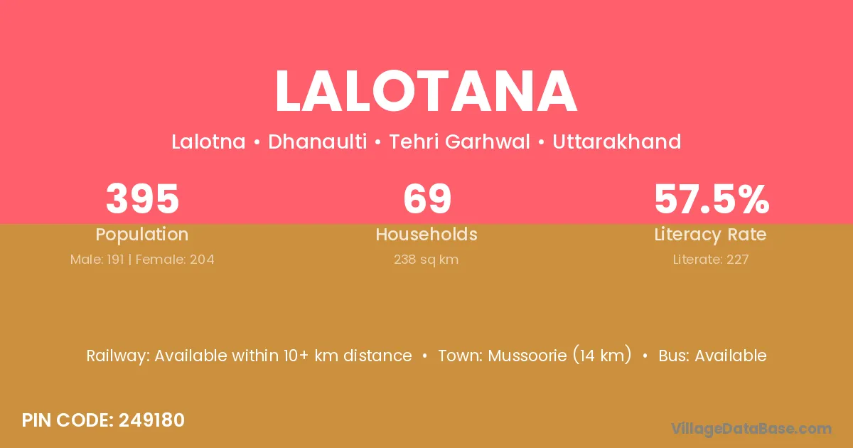 Mussoorie (14 km) is the nearest town to Lalotana village for major economic activities and is located approximately 14 km away.