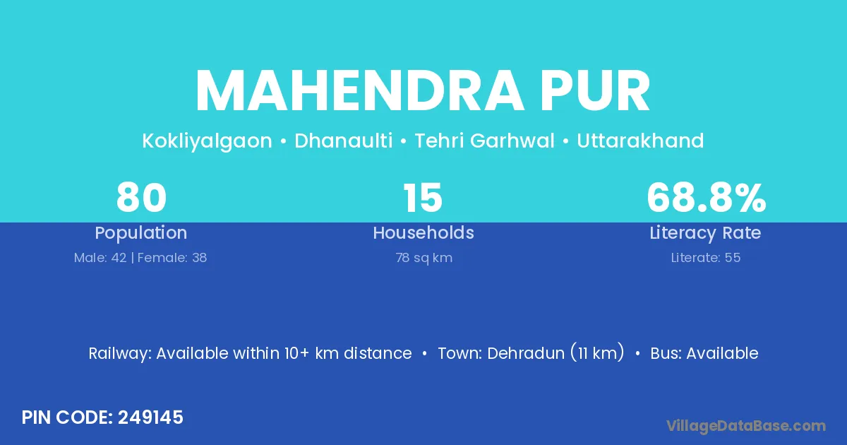 Dehradun (11 km) is the nearest town to Mahendra Pur village for major economic activities and is located approximately 11 km away.