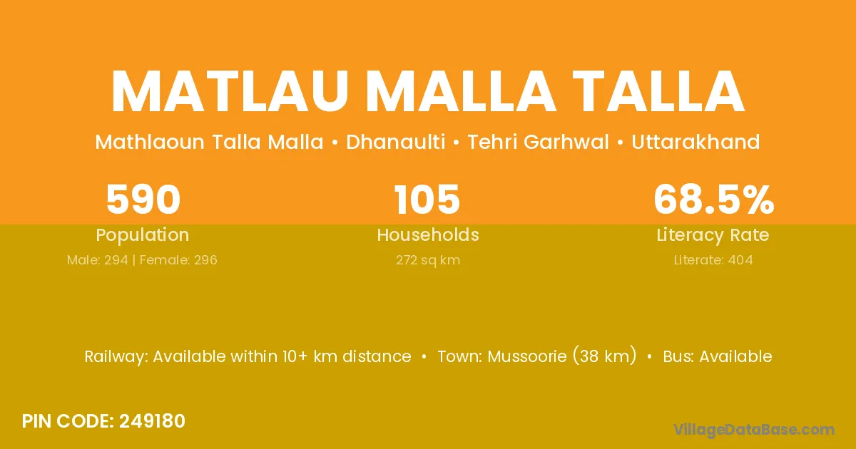Mussoorie (38 km) is the nearest town to Matlau Malla Talla village for major economic activities and is located approximately 38 km away.