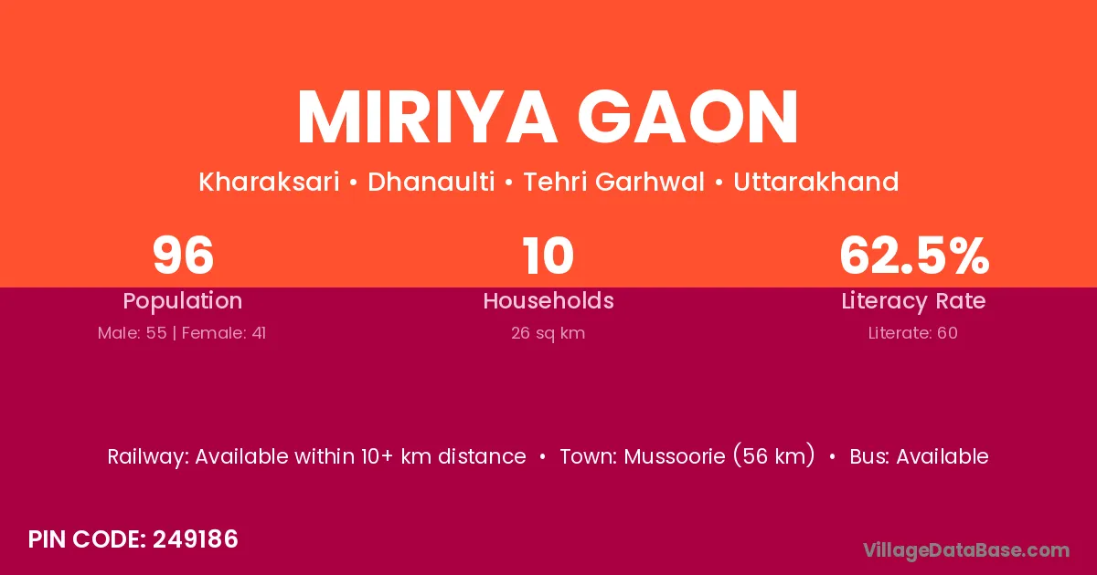 Mussoorie (56 km) is the nearest town to Miriya Gaon village for major economic activities and is located approximately 56 km away.