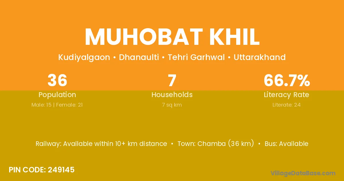 Chamba (36 km) is the nearest town to Muhobat Khil village for major economic activities and is located approximately 36 km away.
