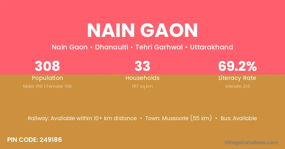 Mussoorie (55 km) is the nearest town to Nain Gaon village for major economic activities and is located approximately 55 km away.