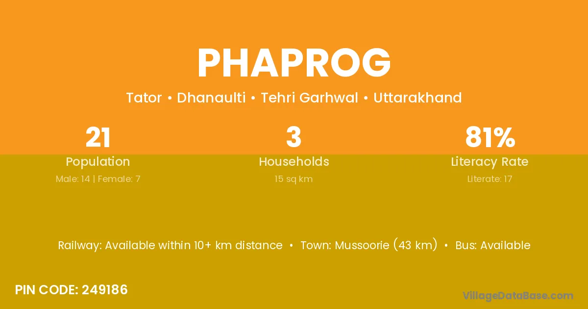 Mussoorie (43 km) is the nearest town to Phaprog village for major economic activities and is located approximately 43 km away.