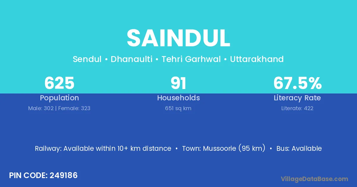 Mussoorie (95 km) is the nearest town to Saindul village for major economic activities and is located approximately 95 km away.