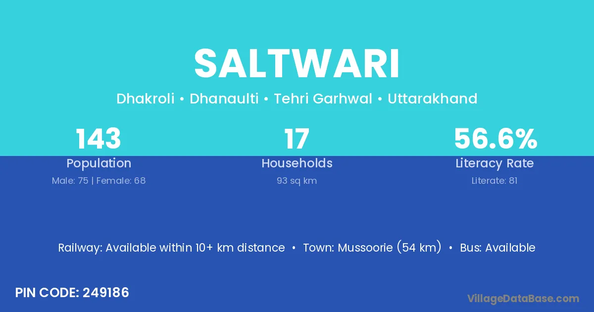 Mussoorie (54 km) is the nearest town to Saltwari village for major economic activities and is located approximately 54 km away.