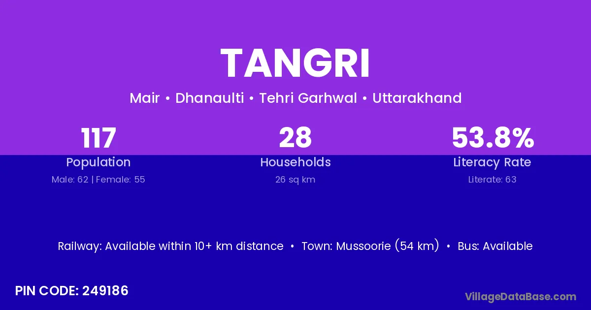 Mussoorie (54 km) is the nearest town to Tangri village for major economic activities and is located approximately 54 km away.