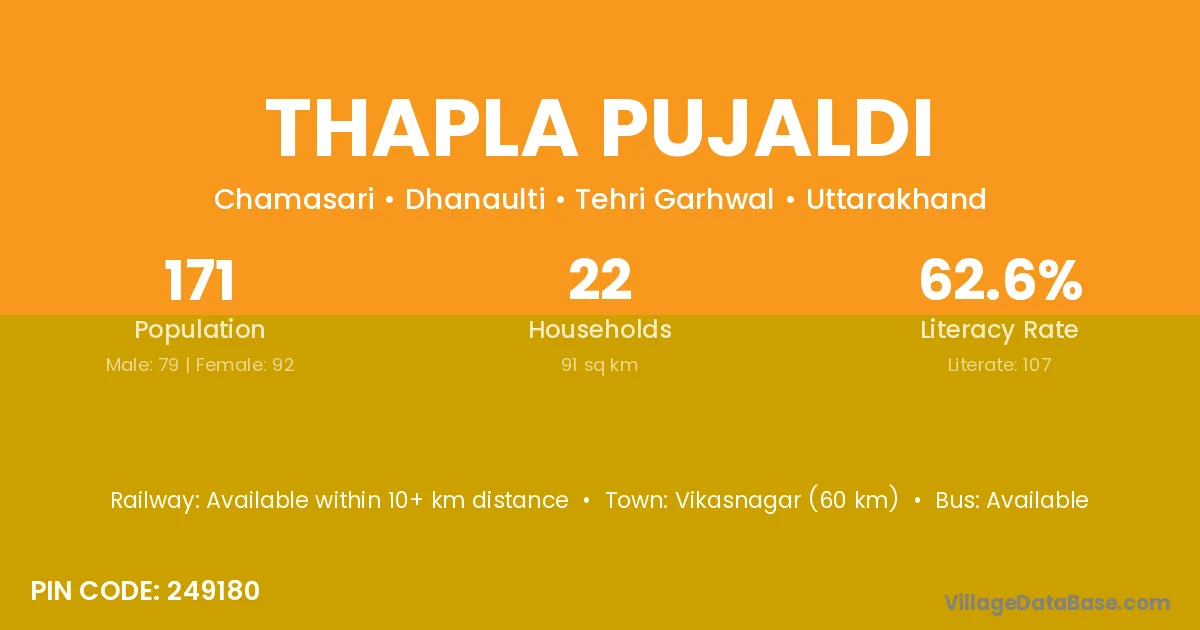Vikasnagar (60 km) is the nearest town to Thapla Pujaldi village for major economic activities and is located approximately 60 km away.