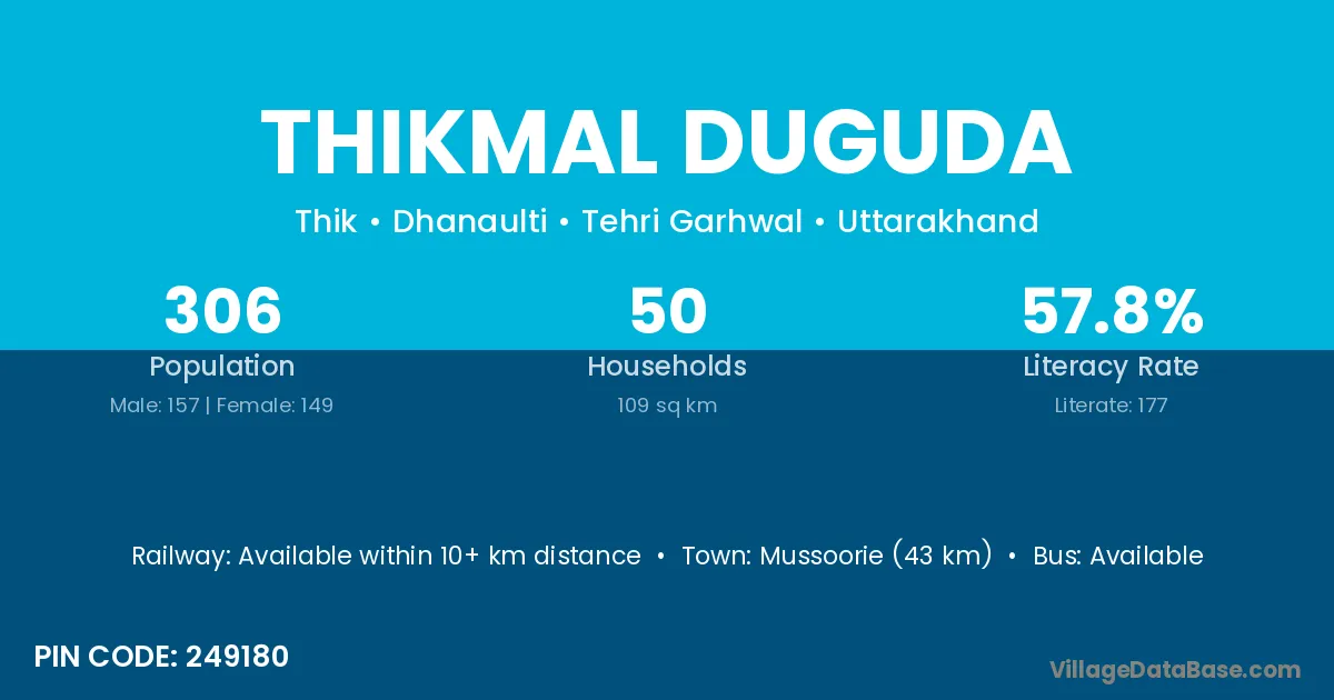 Mussoorie (43 km) is the nearest town to Thikmal Duguda village for major economic activities and is located approximately 43 km away.