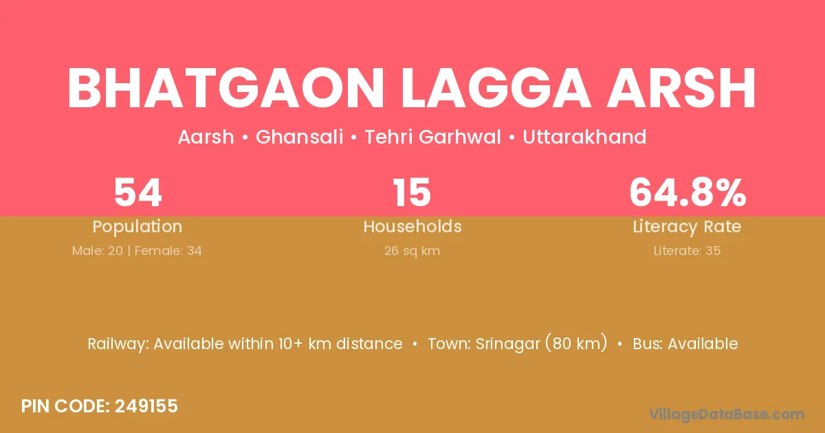 Bhatgaon Lagga Arsh village has a total population of 54 people, of which 20 are males and 34 are females.