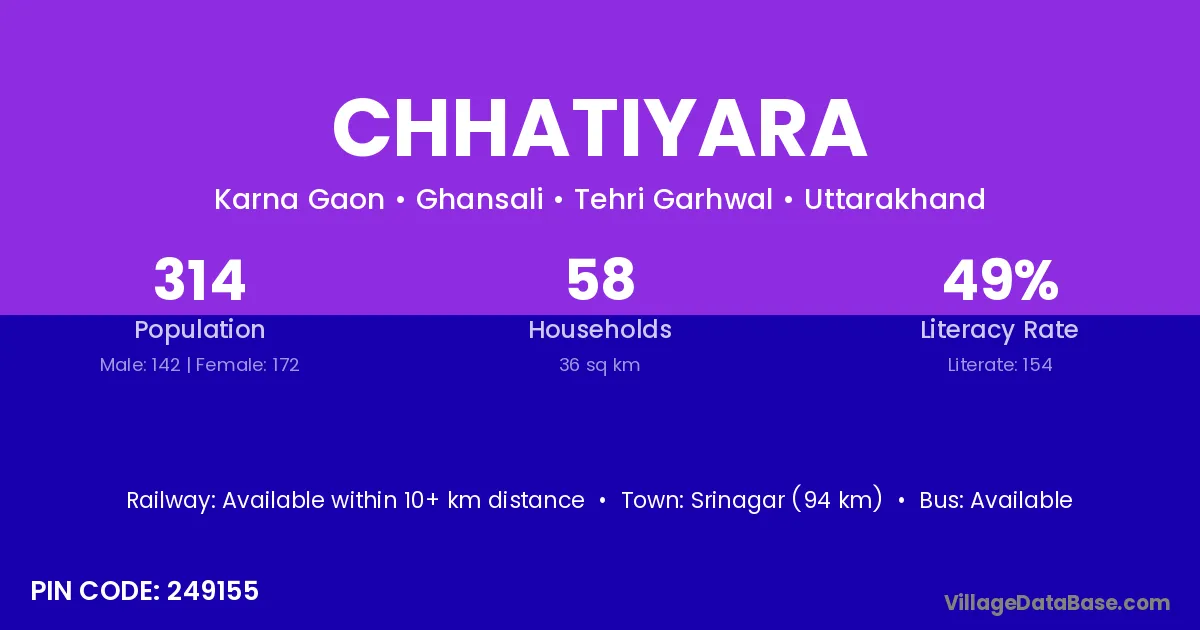 Srinagar (94 km) is the nearest town to Chhatiyara village for major economic activities and is located approximately 94 km away.