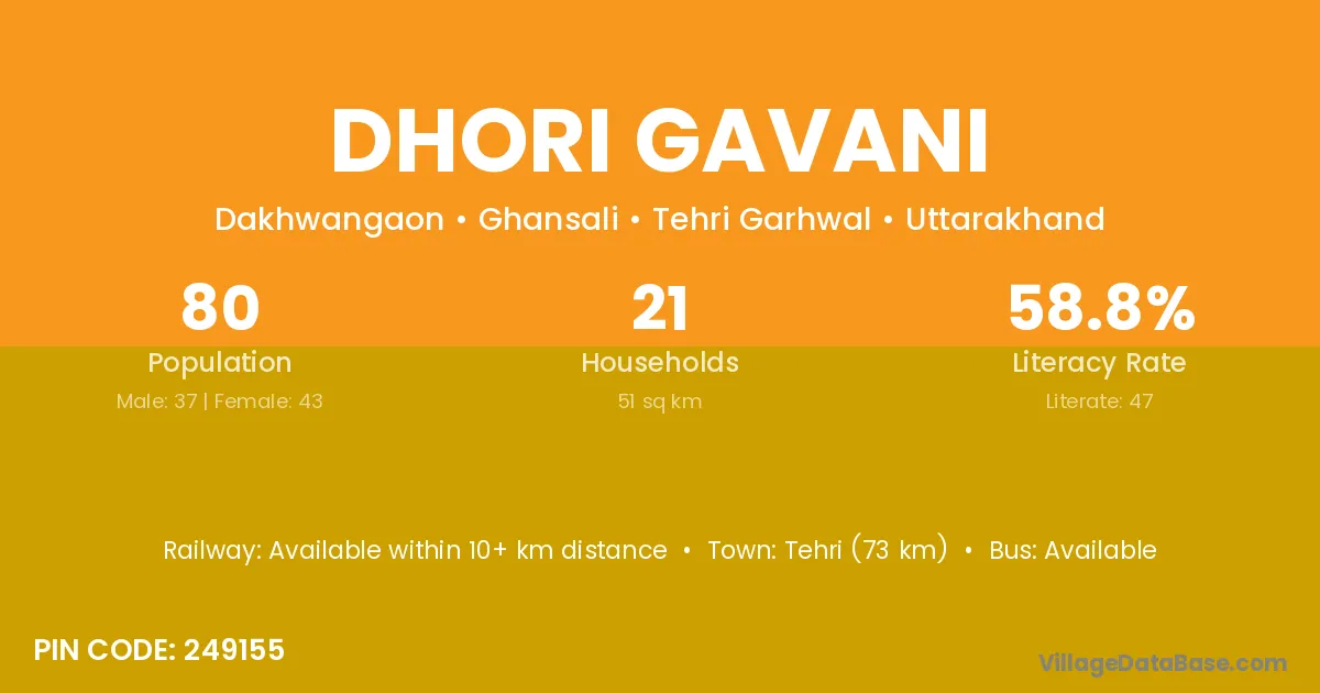 Tehri (73 km) is the nearest town to Dhori Gavani village for major economic activities and is located approximately 73 km away.