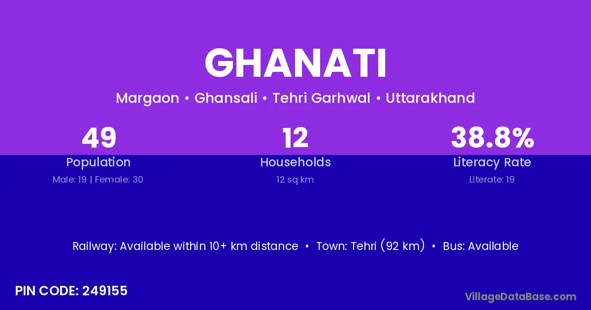 Tehri (92 km) is the nearest town to Ghanati village for major economic activities and is located approximately 92 km away.