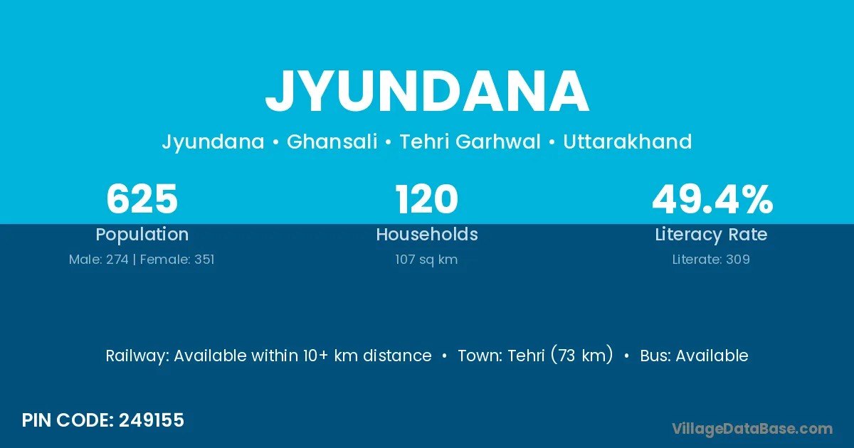 Tehri (73 km) is the nearest town to Jyundana village for major economic activities and is located approximately 73 km away.