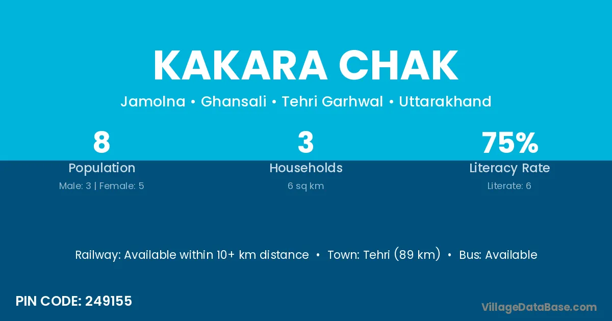 Tehri (89 km) is the nearest town to Kakara Chak village for major economic activities and is located approximately 89 km away.