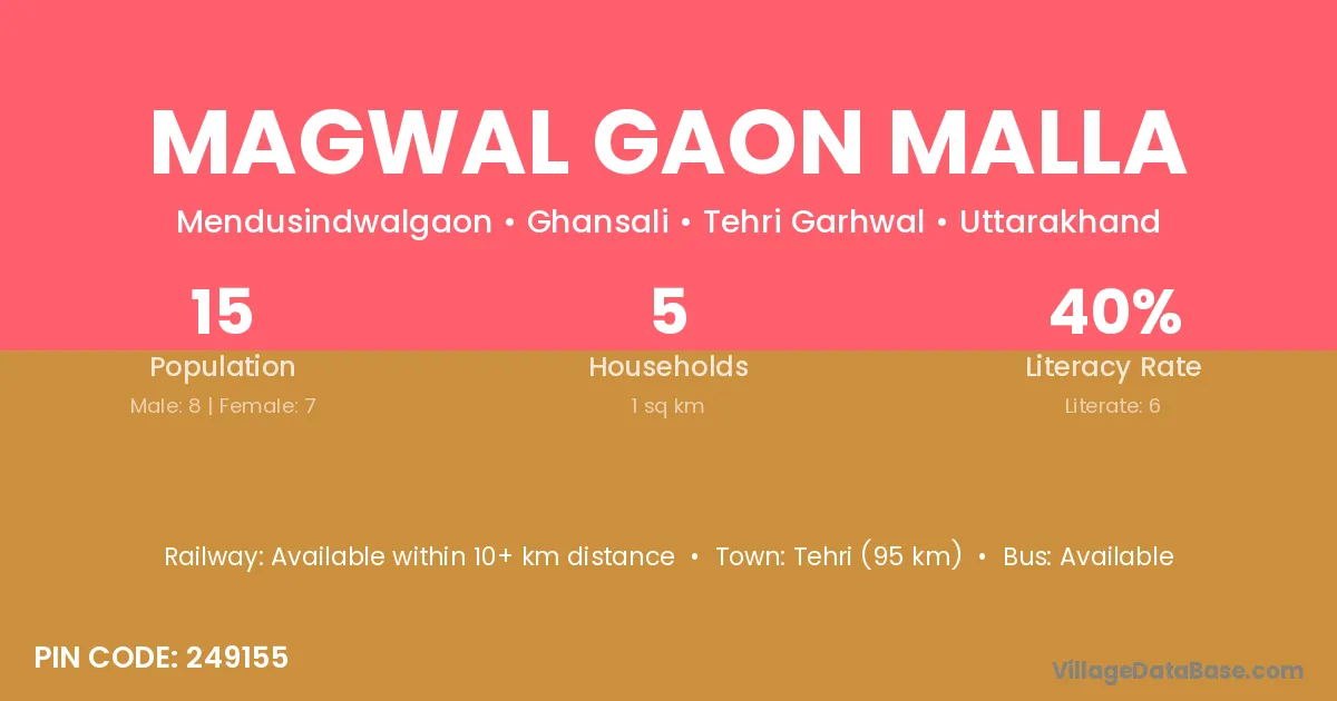 Tehri (95 km) is the nearest town to Magwal Gaon Malla village for major economic activities and is located approximately 95 km away.