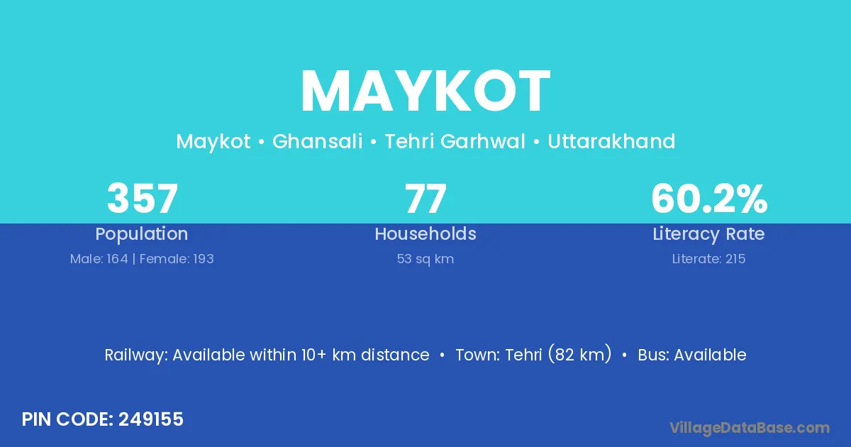 Tehri (82 km) is the nearest town to Maykot village for major economic activities and is located approximately 82 km away.