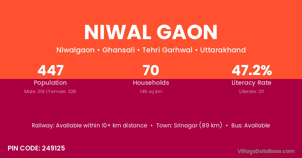 Niwal Gaon village has a total population of 447 people, of which 219 are males and 228 are females.