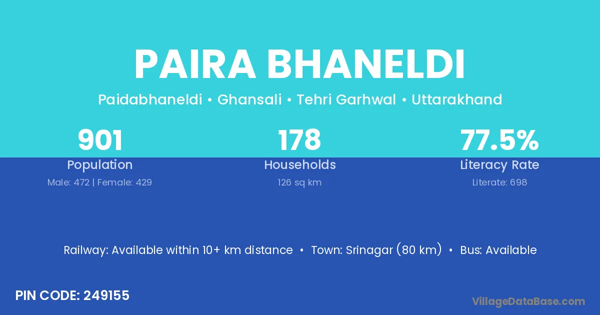 Srinagar (80 km) is the nearest town to Paira Bhaneldi village for major economic activities and is located approximately 80 km away.