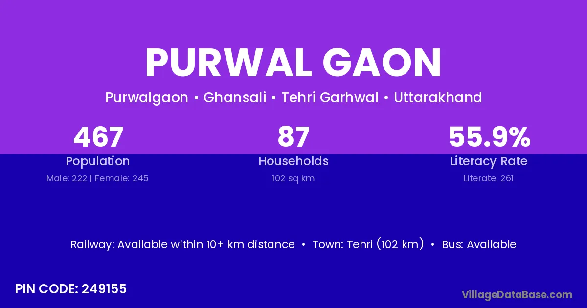 Tehri (102 km) is the nearest town to Purwal Gaon village for major economic activities and is located approximately 102 km away.