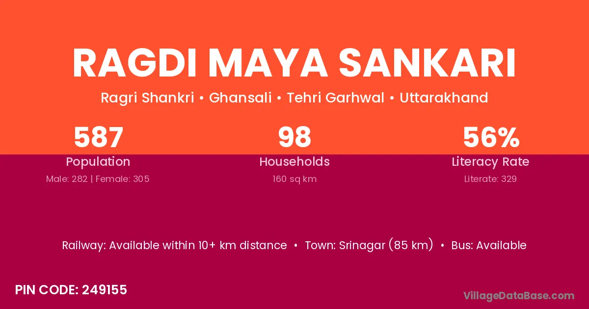 Srinagar (85 km) is the nearest town to Ragdi Maya Sankari village for major economic activities and is located approximately 85 km away.